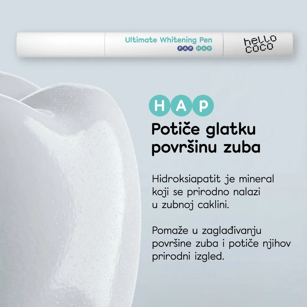 Hydroxyapatit (HAp) je rijedak mineral koji se prirodno javlja u vašoj zubnoj caklini. Formula PAP sadrži njegovu sintetičku verziju koja pomaže zaglađivanju mikropukotina na zubima gdje se hvata plak. Istovremeno stvara zaštitni sloj koji čini zube otpornijima na karijes.