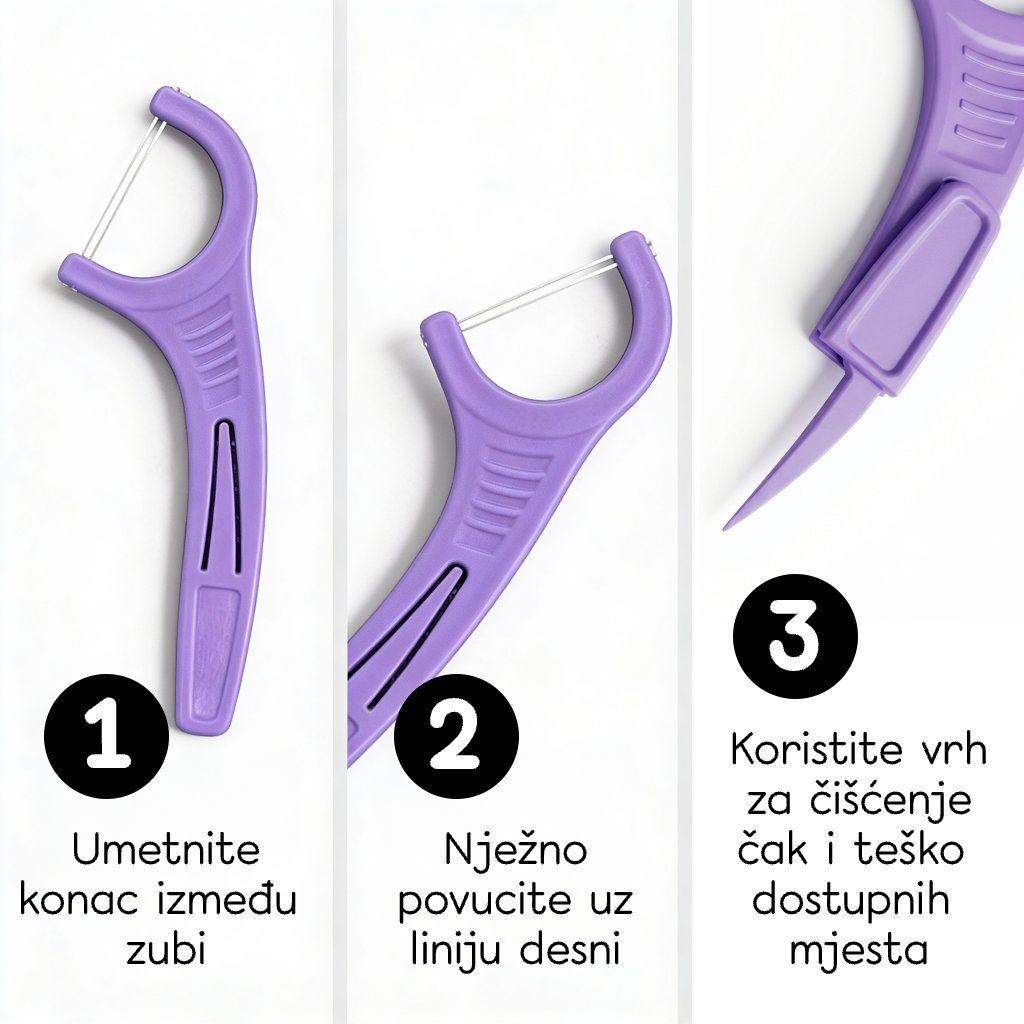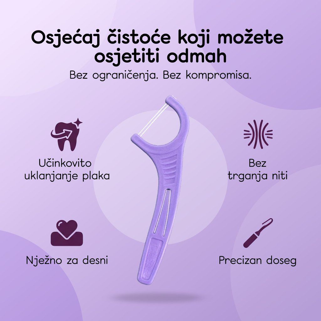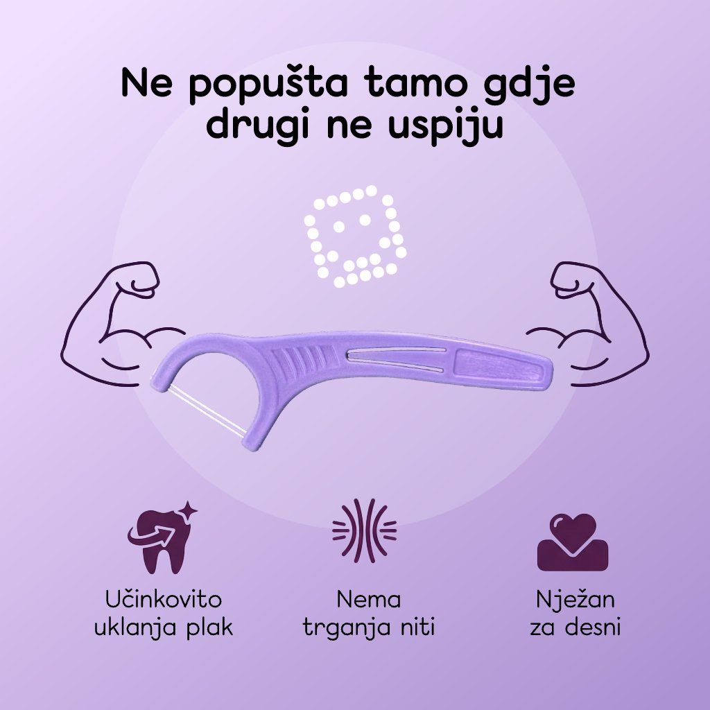 Na mjestima do kojih četkica ne dopire, važna je redovita njega. Dentalne čačkalice s koncem učinkovito uklanjaju ostatke hrane i plak između zubi te pomažu održavati zdrave desni i svjež dah svaki dan.