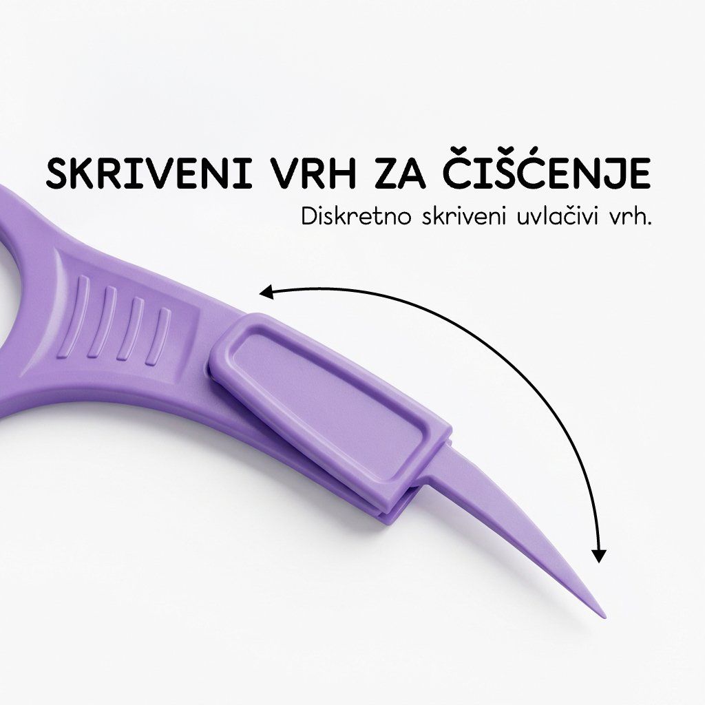 Ergonomski oblik i protuklizna drška osiguravaju udobnu upotrebu i bolju kontrolu pri čišćenju. Praktični vrh dentalne čačkalice pomaže ukloniti veće nečistoće.