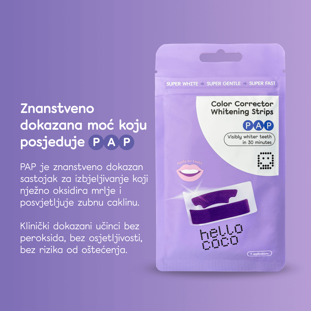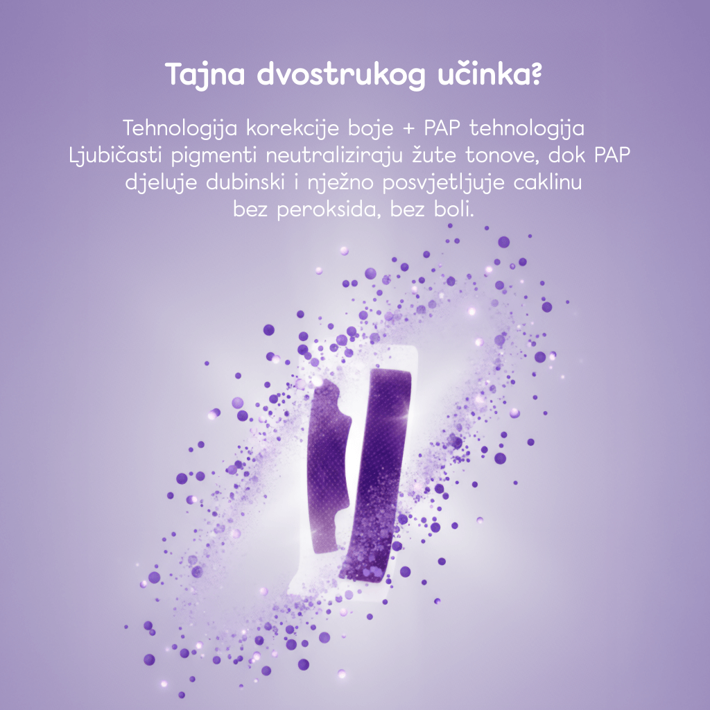Otkrijte revolucionarne trakice za izbjeljivanje s dvostrukim učinkom koje kombiniraju tehnologiju korekcije boje s učinkovitom PAP formulom. Ljubičasti pigment odmah neutralizira žuti ton zubi, dok PAP (ftalimidoperoksikaproinska kiselina) djeluje dubinski na površinu cakline, smanjujući mrlje i podržava njezino prirodno izbjeljivanje bez peroksida.