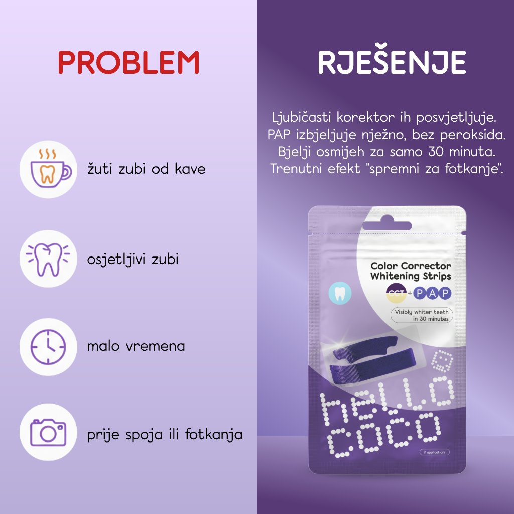 Trakice za izbjeljivanje s PAP tehnologijom pružaju vidljivo izbjeljivanje zubi, a CCT trakice pružaju trenutni optički učinak uz stvarno izbjeljivanje. Rezultat je učinkovito, nježno i istovremeno najugodnije izbjeljivanje zubi u našoj ponudi.